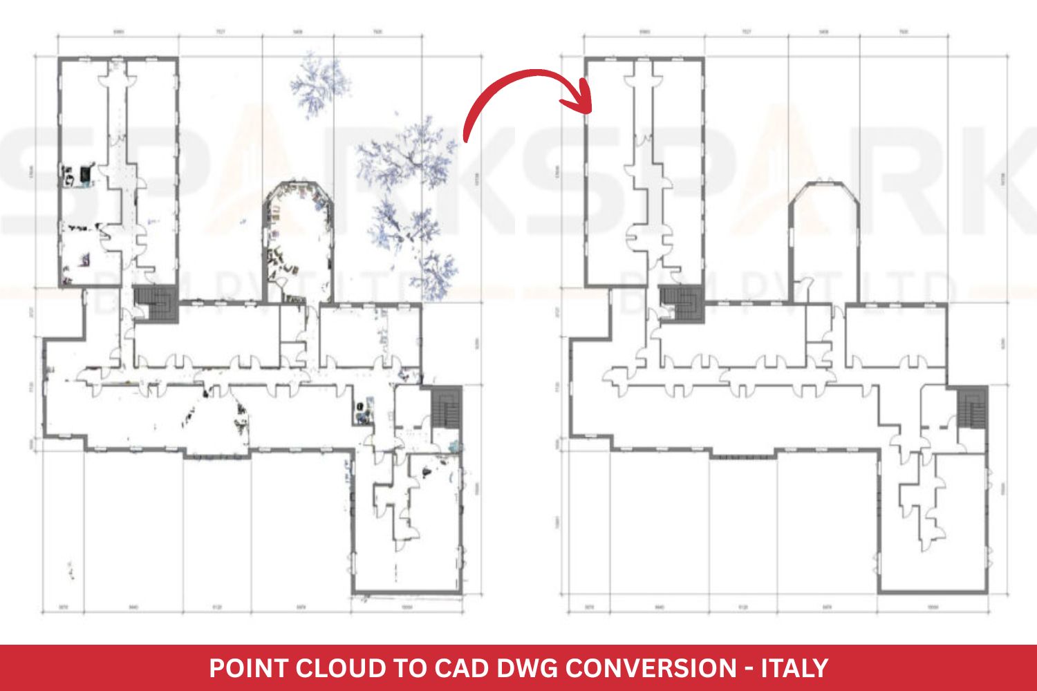 We follow international CAD and drafting standards while tailoring each solution to meet Italy’s architectural, industrial, and construction needs. Our Point Cloud to DWG conversion services help reduce design errors, eliminate rework, and streamline your project workflows. Whether you require as-built floor plans, elevations, sections, or 3D mechanical layouts, Spark BIM delivers with unmatched quality and professionalism.